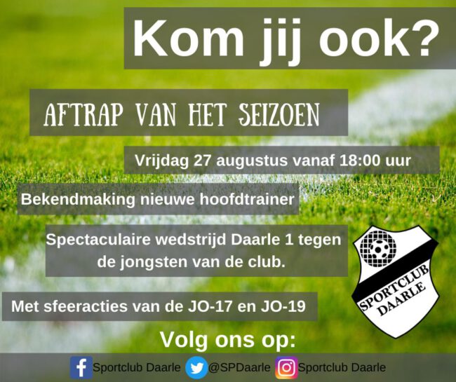Op vrijdag 27 augustus opent Sportclub Daarle het nieuwe voetbalseizoen met ‘de Aftrap’. Het openingswoord zal om 18.15uur gehouden worden door onze voorzitter Henk KleinJan. Tijdens ‘de Aftrap’ zal Nando Kok bekend worden gemaakt als nieuwe hoofdtrainer aan het publiek. Hij zal daarna zijn team coachen tijdens de wedstrijd Sp Daarle 1 tegen de Sp Daarle Mini’s+ JO10. De ballenjongens & meiden…